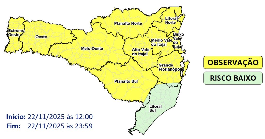 A Defesa Civil de Santa Catarina emitiu um alerta para a possibilidade de temporais isolados em várias regiões do estado. Com a formação de uma área de baixa pressão e o aumento da umidade, há risco de chuva forte, ventos intensos e granizo, especialmente entre a tarde e a noite de sábado (22).
