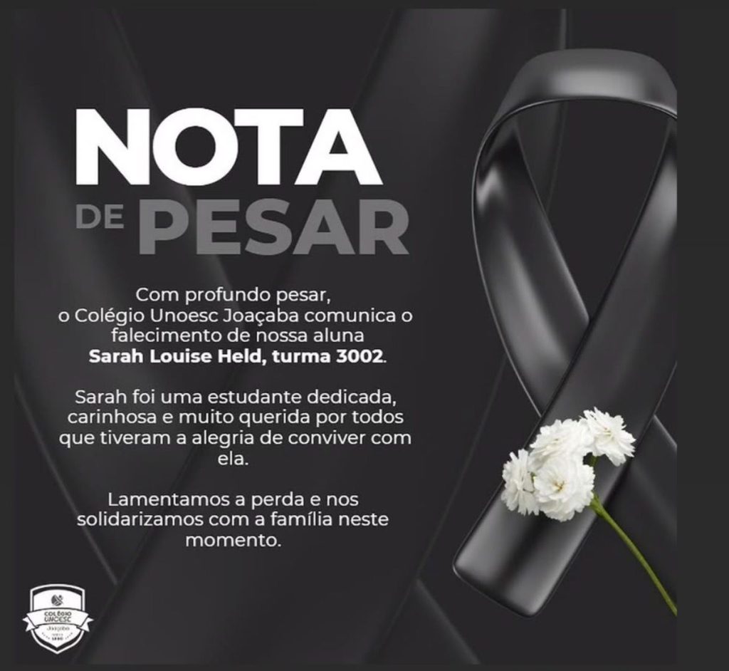 A jovem era estudante do Colégio Unoesc de Joaçaba e se formaria neste sábado no terceirão. Ela e mais duas pessoas estavam no carro.