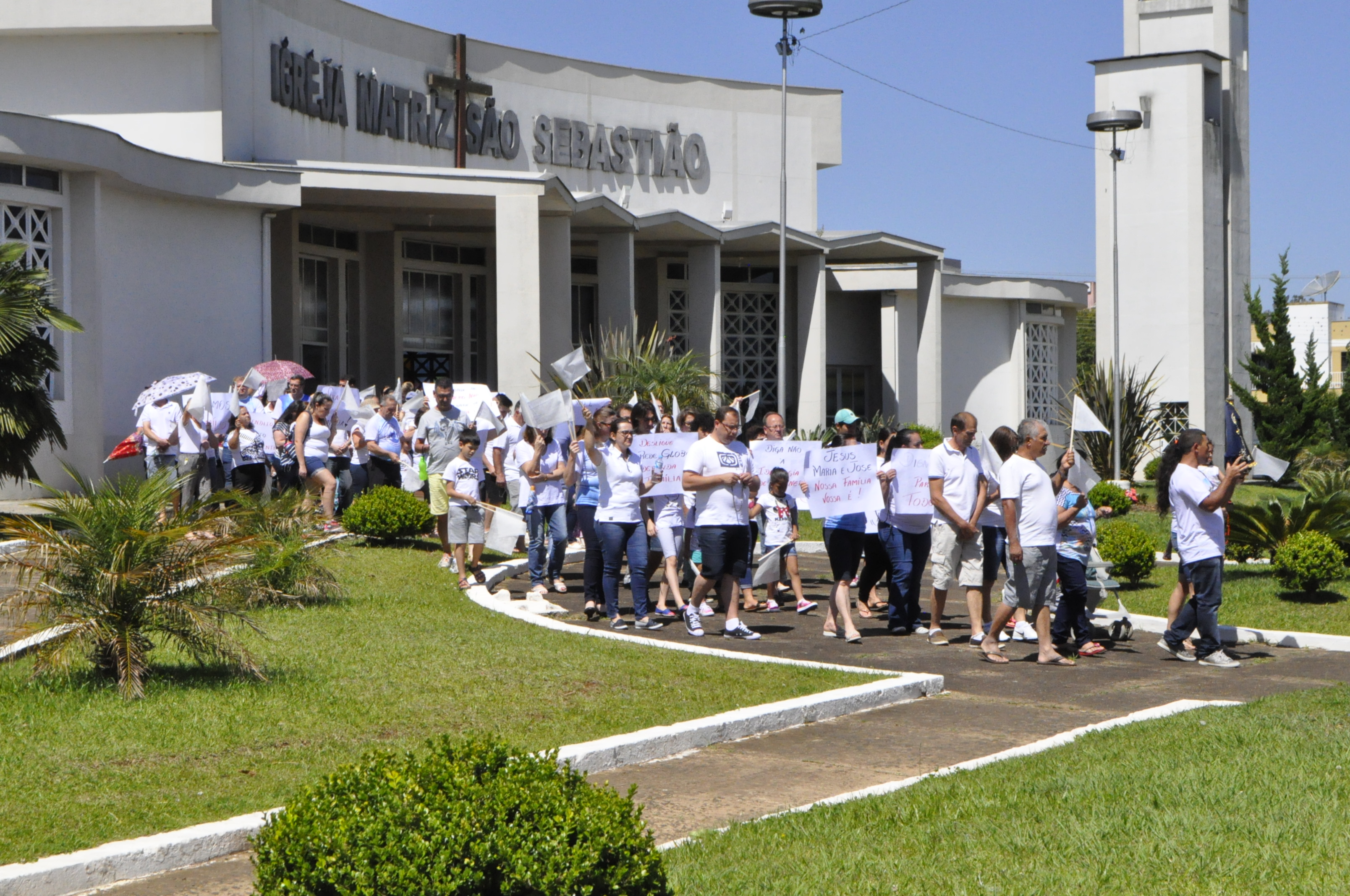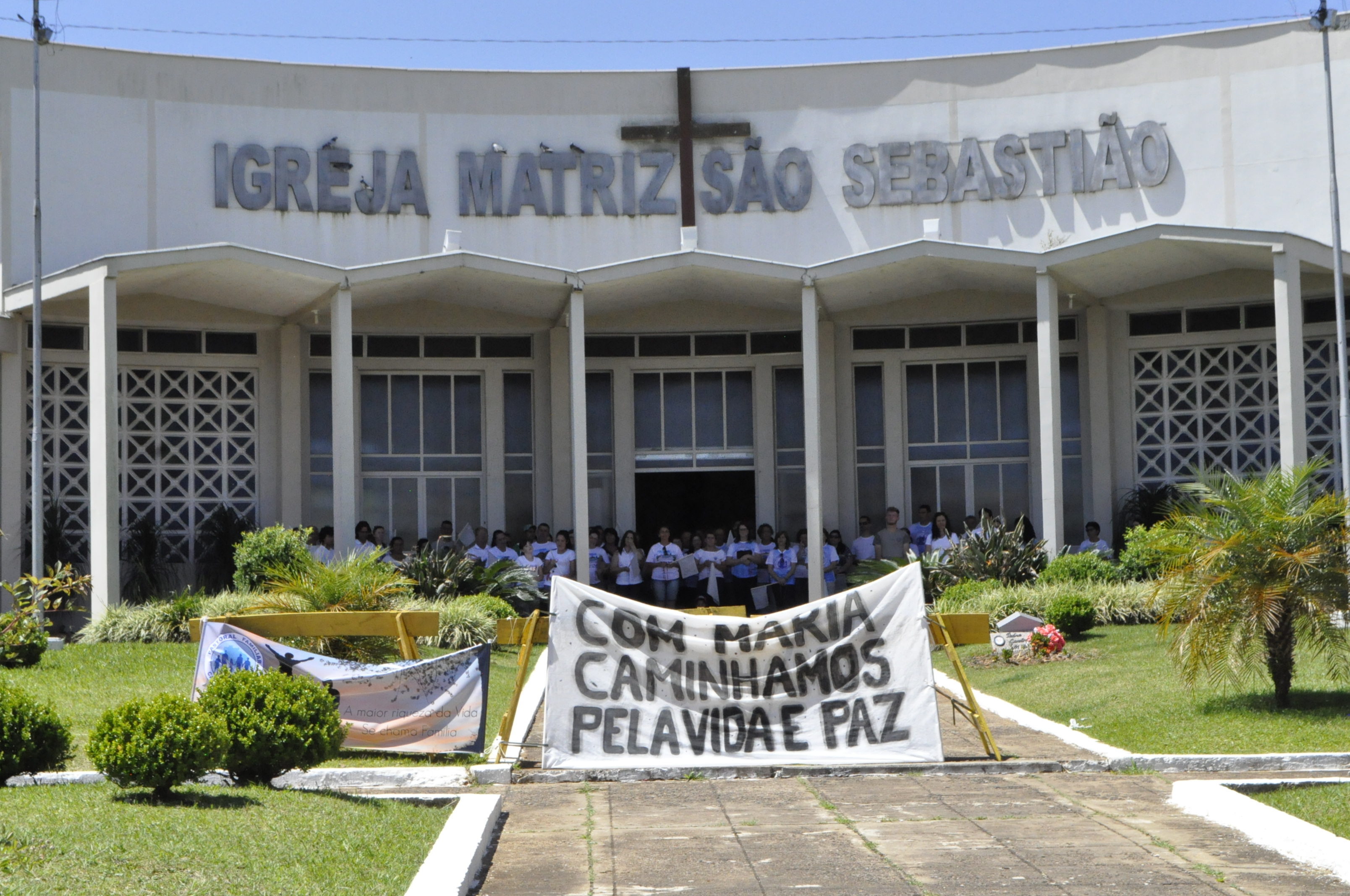 Fiéis vestidos de branco e de diversos movimentos da Igreja católica da paróquia de Catanduvas, reuniram-se em frente à Igreja Matriz ás 14 horas com orações e reflexões, bandeirolas e cartazes.