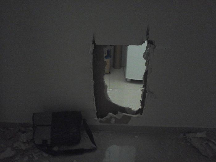 Já dentro do prédio, eles ainda teriam aberto 07 portas, até chegar no local específico onde quebraram a parede dos fundos da relojoaria, provavelmente com o uso de uma marreta, dando acesso ao interior da loja.