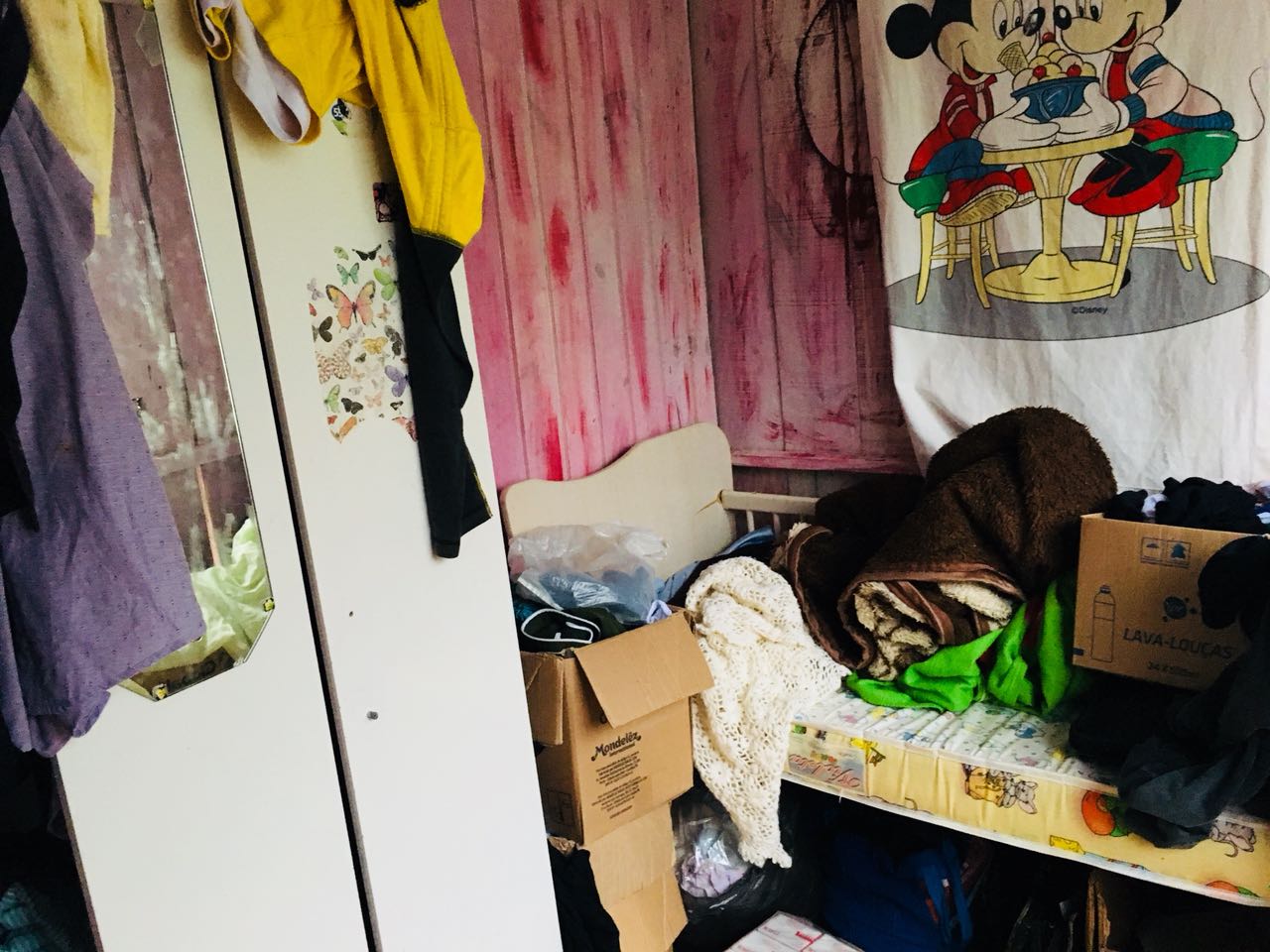 Os poucos móveis que possuem são emprestados do dono da casa, a família não tem guarda-roupas, aliás, as poucas roupas que tem estão em caixas de papelão, não tem camas ou geladeira, faltam produtos alimentícios e de higiene e limpeza.